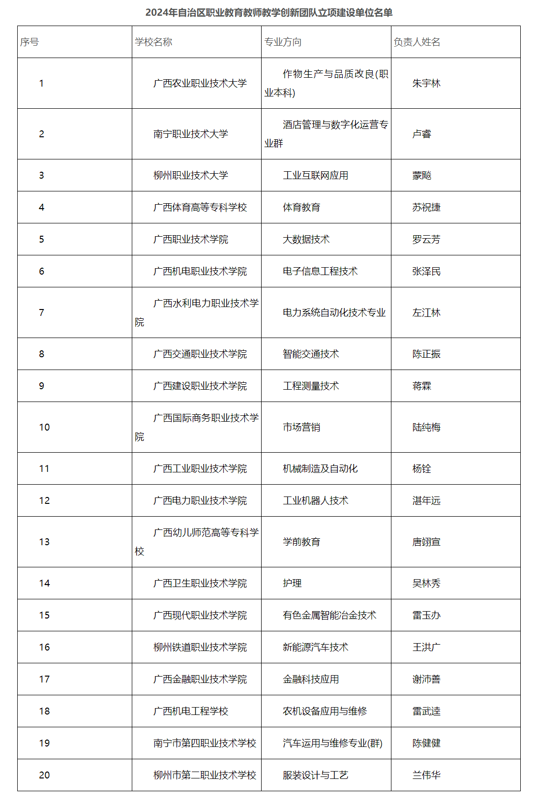 根據(jù)《自治區(qū)教育廳關(guān)于開展2024年自治區(qū)職業(yè)教育教師教學(xué)創(chuàng)新團(tuán)隊(duì)立項(xiàng)建設(shè)工作的通知》(桂教教師〔2024〕14號)精神,經(jīng)申報推薦、資格審查、專家評審等環(huán)節(jié),遴選出20個自治區(qū)職業(yè)教育教師教學(xué)創(chuàng)新團(tuán)隊(duì)立項(xiàng)建設(shè),現(xiàn)將立項(xiàng)建設(shè)單位名單(見附件)予以公示。公示期為5個工作日,時間從2024年7月12日起至2024年7月18日。